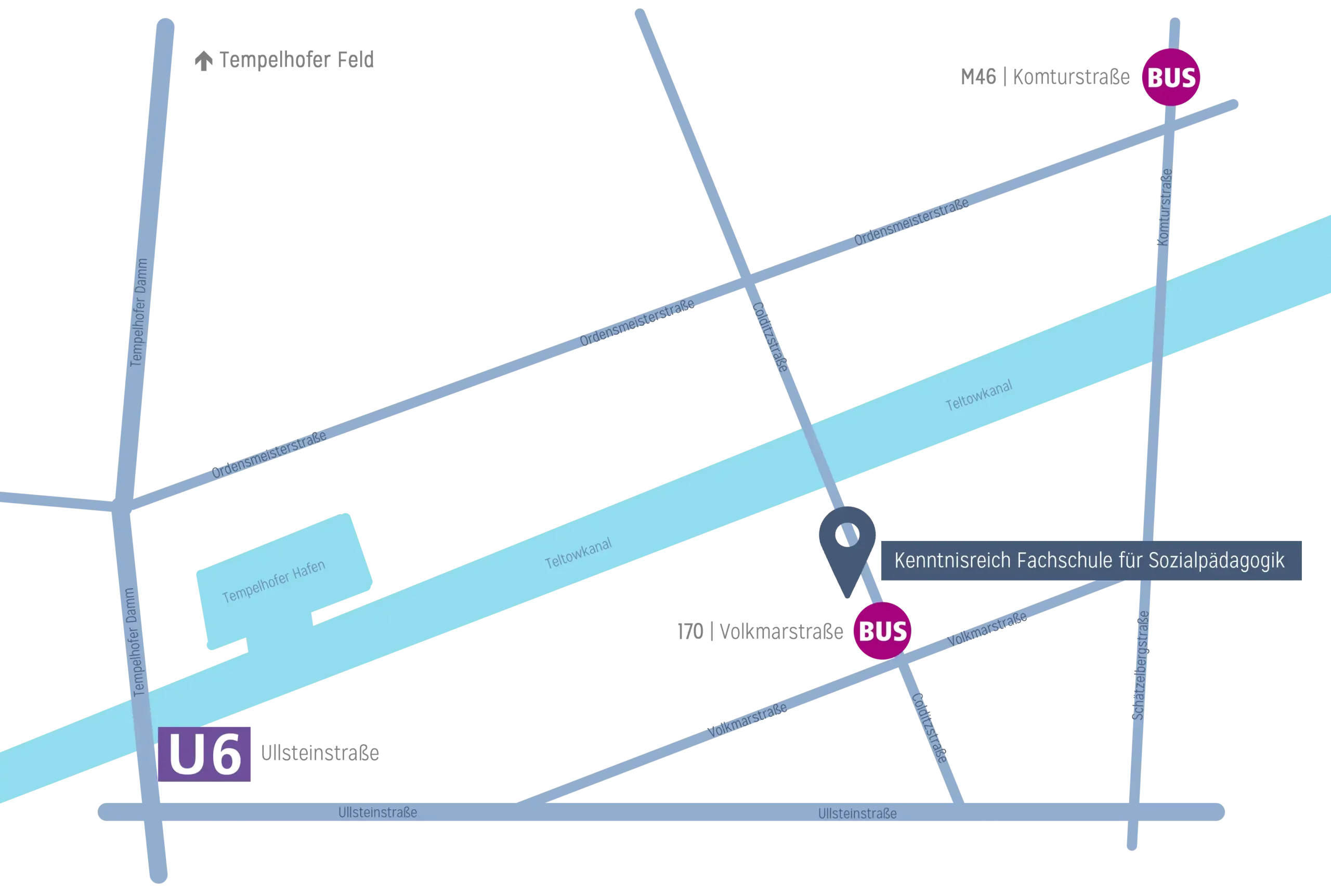 Mitten in Tempelhof liegt unsere Fachschule in Wassernähe und ist mit den Buslinien 170 und M46 sowie mit der U6 gut erreichbar.
